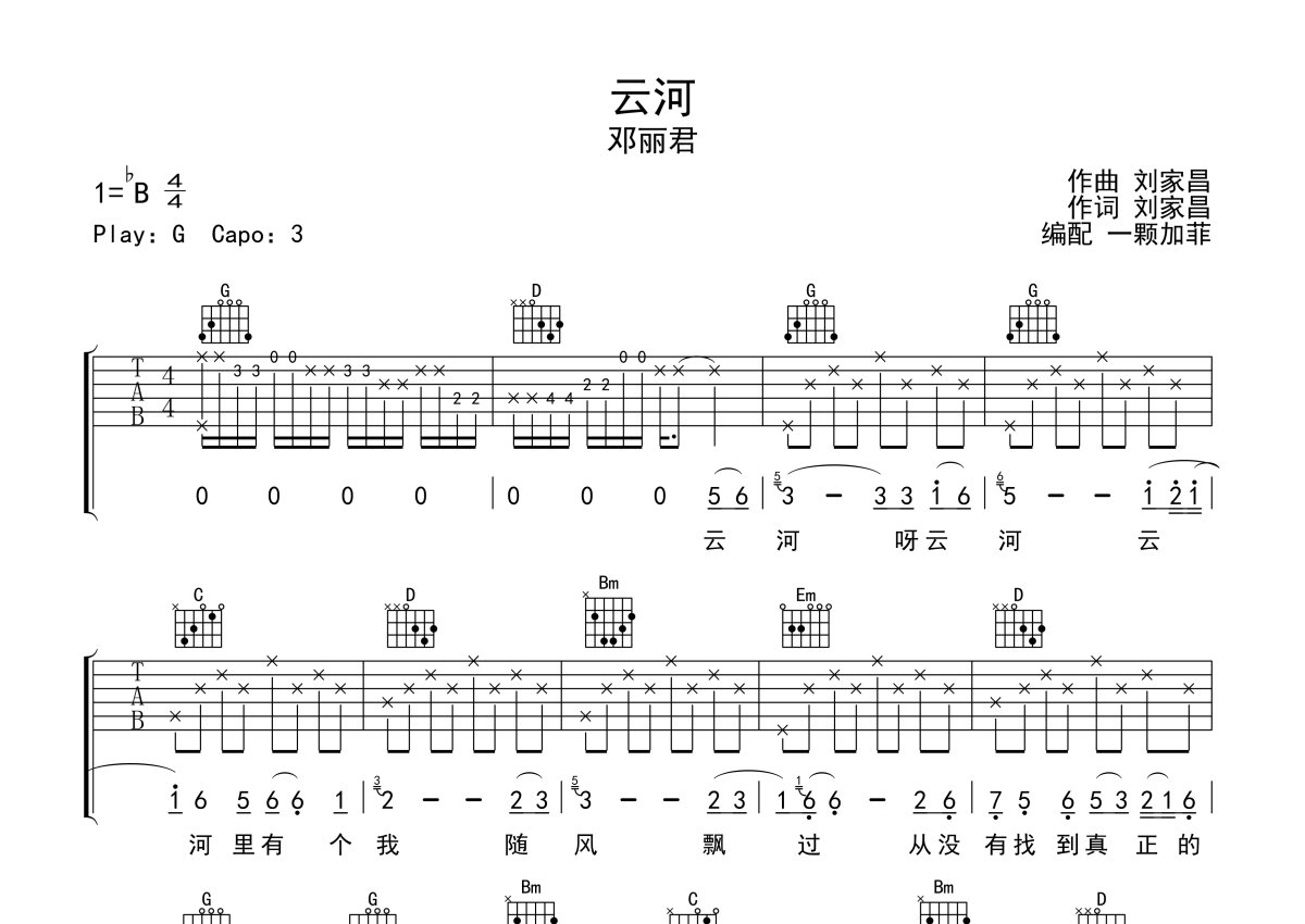 邓丽君《云河》吉他谱 - G调弹唱六线谱