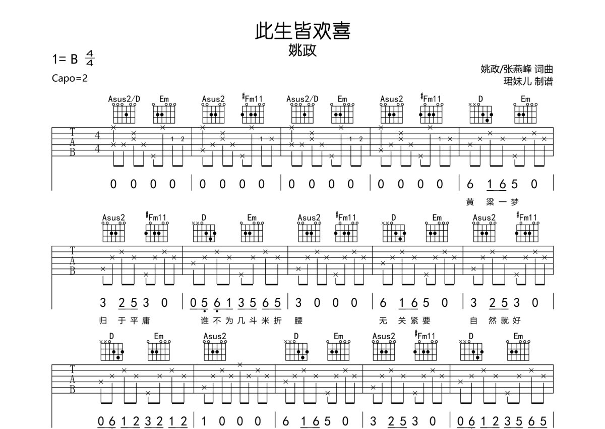 姚政《此生皆欢喜》吉他谱 - B调弹唱六线谱