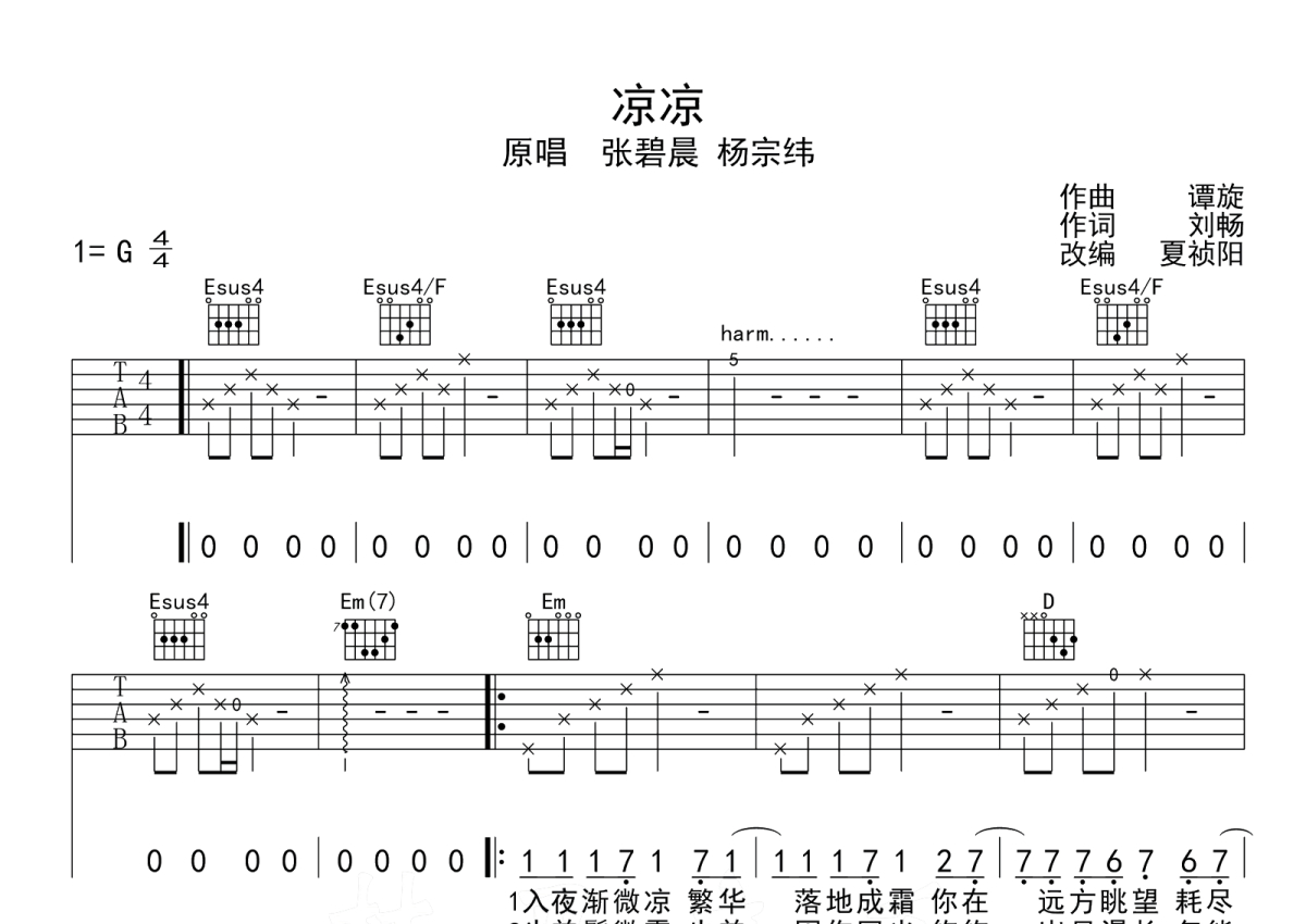 张碧晨《凉凉》吉他谱 - G调弹唱六线谱