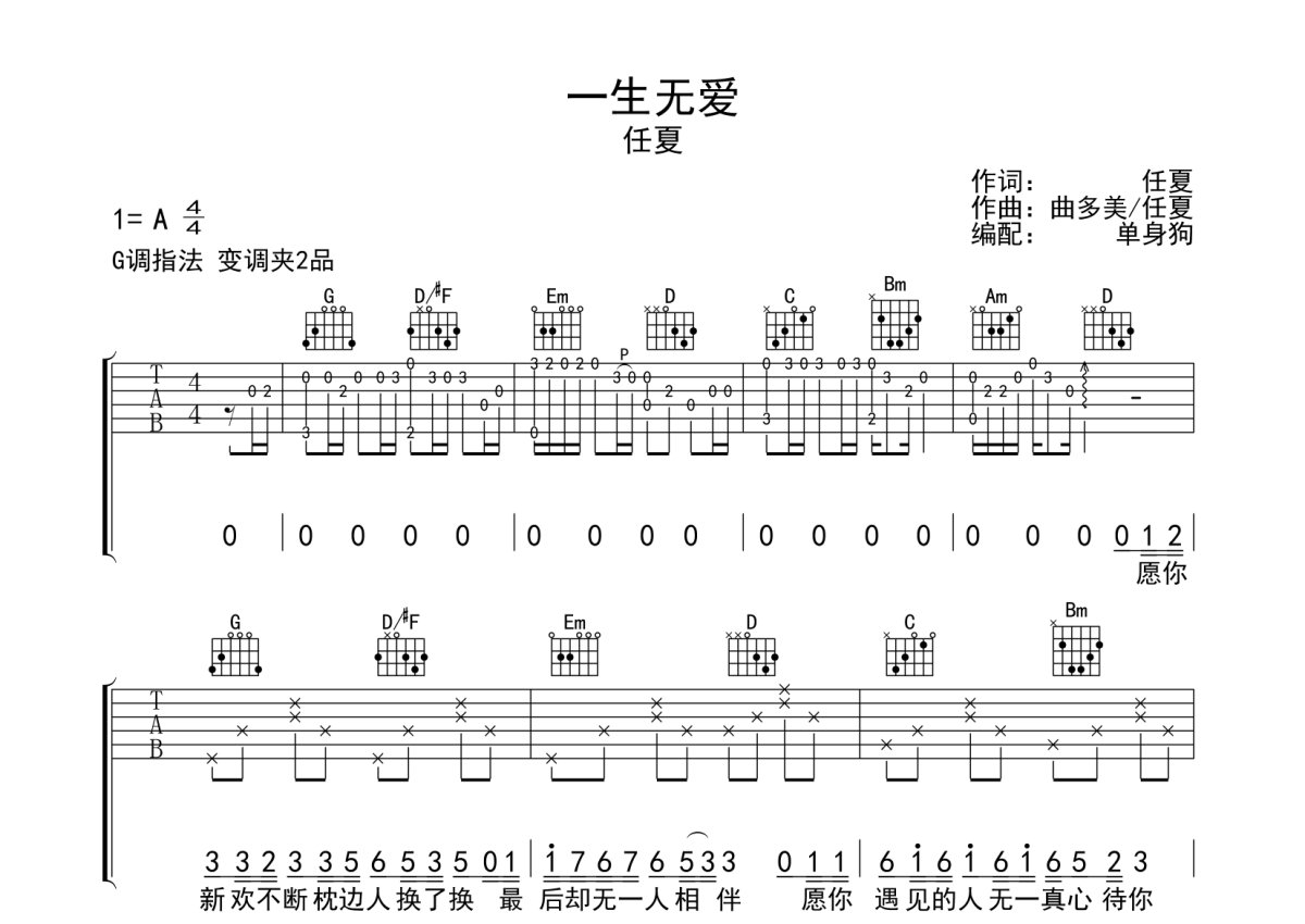 任夏《一生无爱》吉他谱 - G调弹唱六线谱