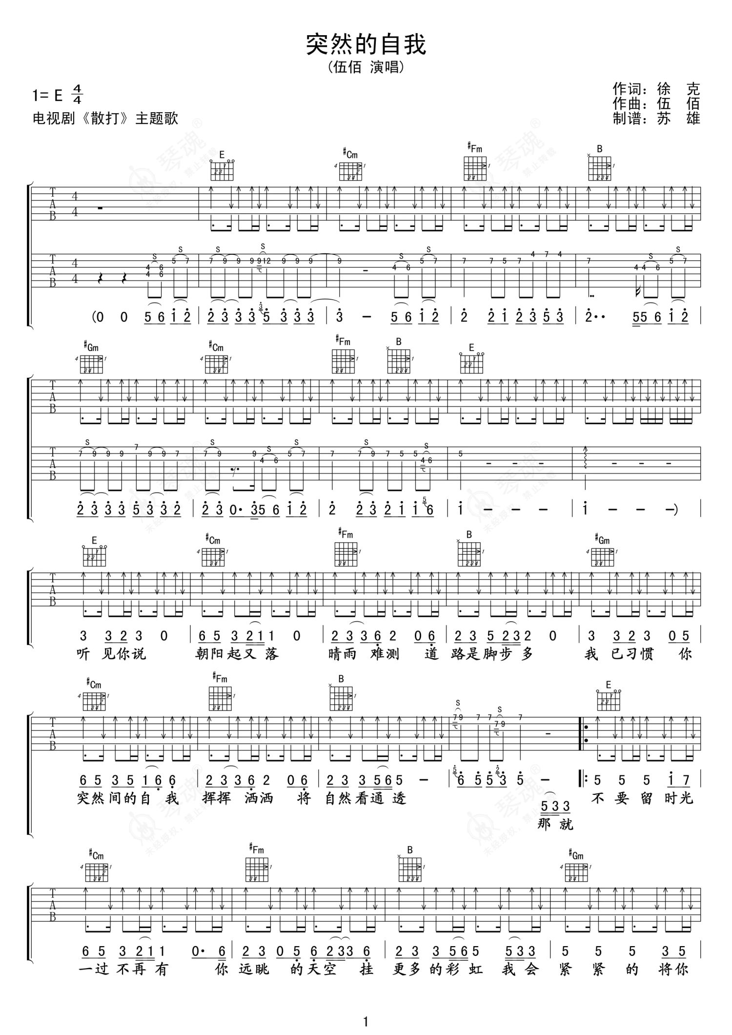 伍佰《突然的自我》吉他谱 - E调弹唱六线谱