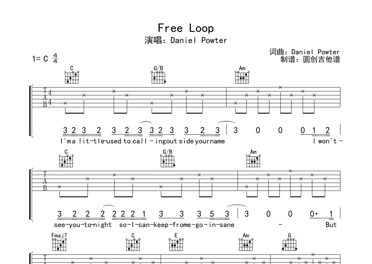 Daniel Powter《Free Loop》吉他谱 - C调弹唱六线谱