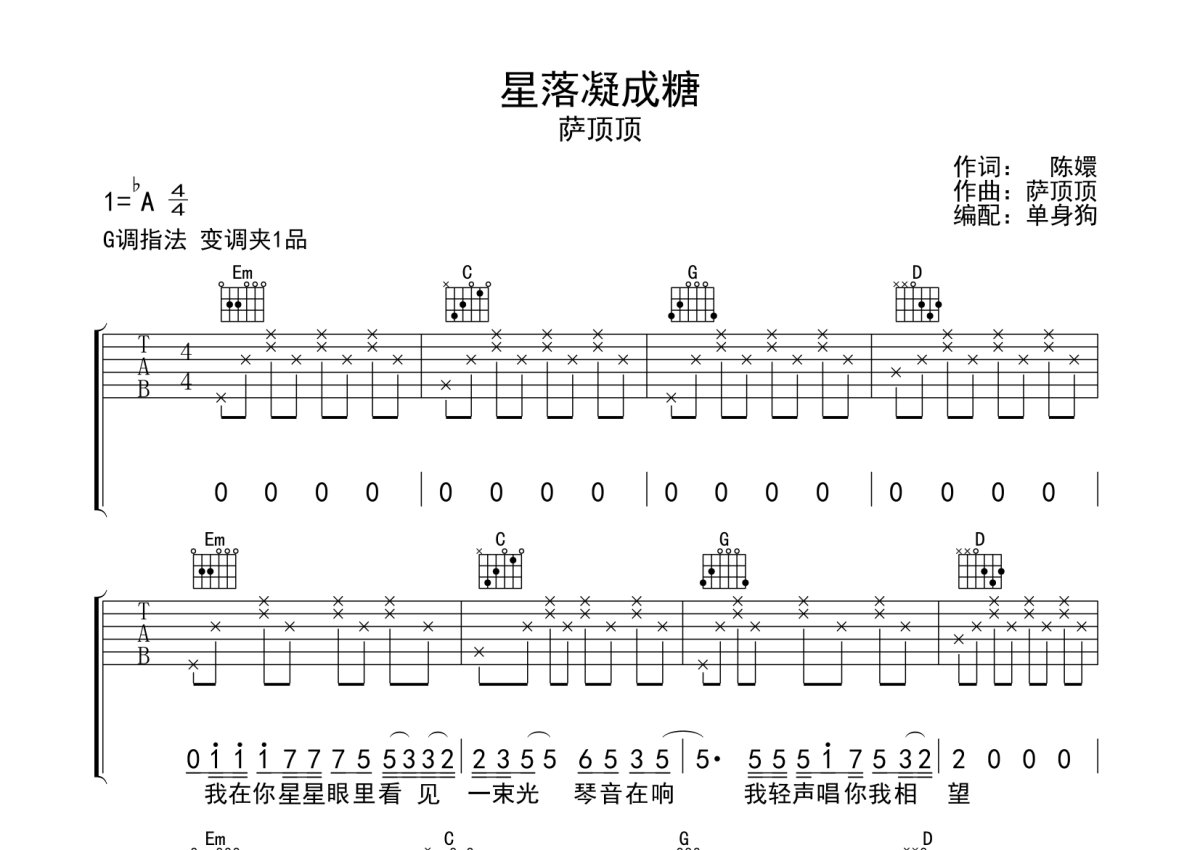 萨顶顶《星落凝成糖》吉他谱 - G调弹唱六线谱