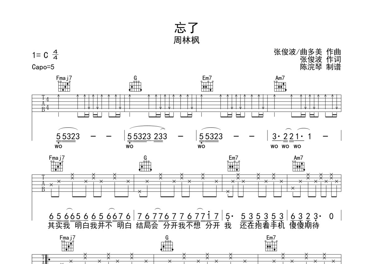 周林枫《忘了》吉他谱 - C调弹唱六线谱
