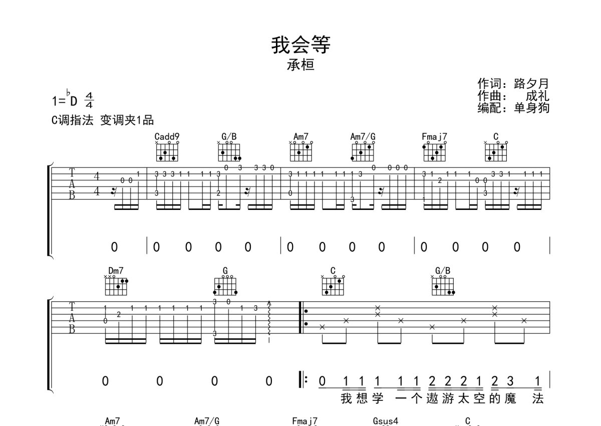 《我会等》是承桓演唱的一首歌曲,本吉他谱采用的是C调指法编配,这份吉他谱共有三张高清图谱,图谱由 @单身狗 编配上传,图谱使用六线谱编配,包含吉他和弦指法、简谱以及歌词部分,使用这份我会等吉他谱,可以让你更加方便地掌握这首歌曲的弹唱技巧,快来尝试吧。