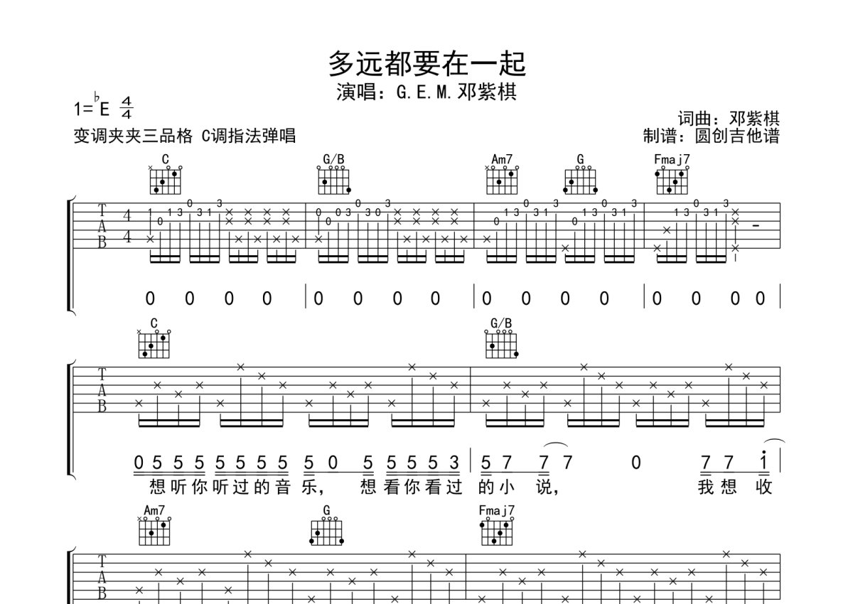《多远都要在一起》是邓紫棋演唱的一首歌曲,本吉他谱采用的是C调指法编配,这份吉他谱共有四张高清图谱,图谱由 @圆创吉他谱 编配上传,图谱使用六线谱编配,包含吉他和弦指法、简谱以及歌词部分,曲谱配备了相关的音频提供试听,使用这份多远都要在一起吉他谱,可以让你更加方便地掌握这首歌曲的弹唱技巧,快来尝试吧。