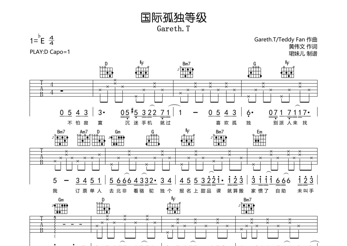 Gareth.T《国际孤独等级》吉他谱 - D调弹唱六线谱