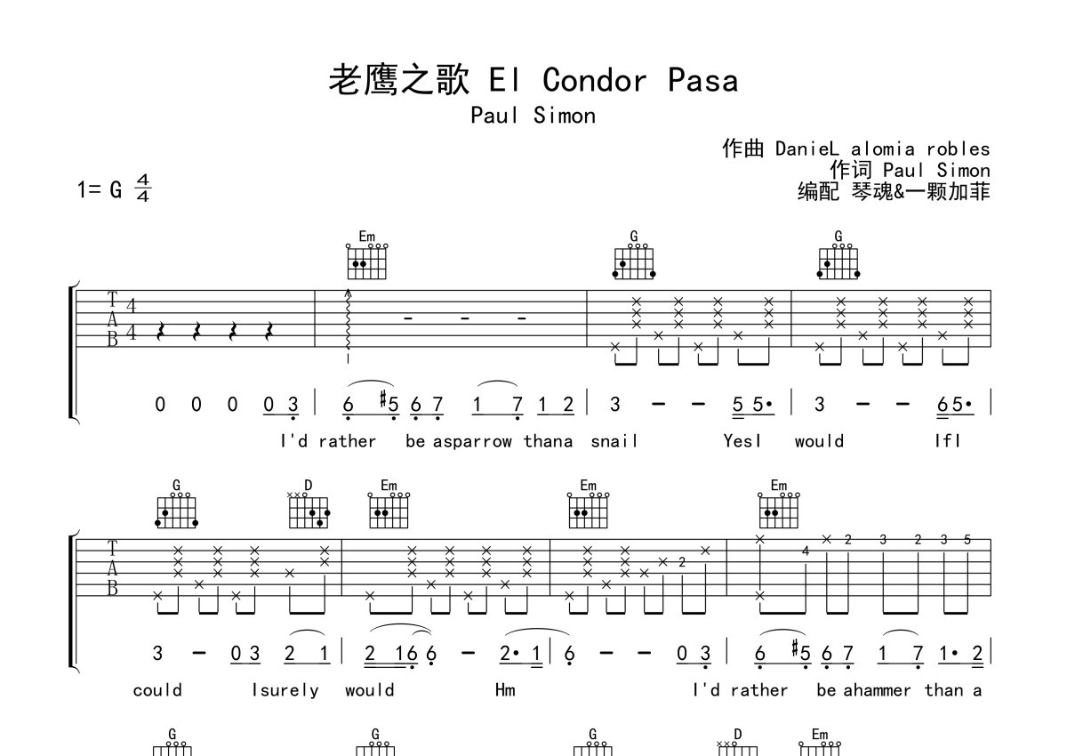 《El Condor Pasa(老鹰之歌)》是Paul Simon演唱的一首歌曲,本吉他谱采用的是G调指法编配,这份吉他谱共有两张高清图谱,图谱由 @一颗加菲 编配上传,图谱使用六线谱编配,包含吉他和弦指法、简谱以及歌词部分,曲谱配备了相关的音频提供试听,使用这份El Condor Pasa(老鹰之歌)吉他谱,可以让你更加方便地掌握这首歌曲的弹唱技巧,快来尝试吧。