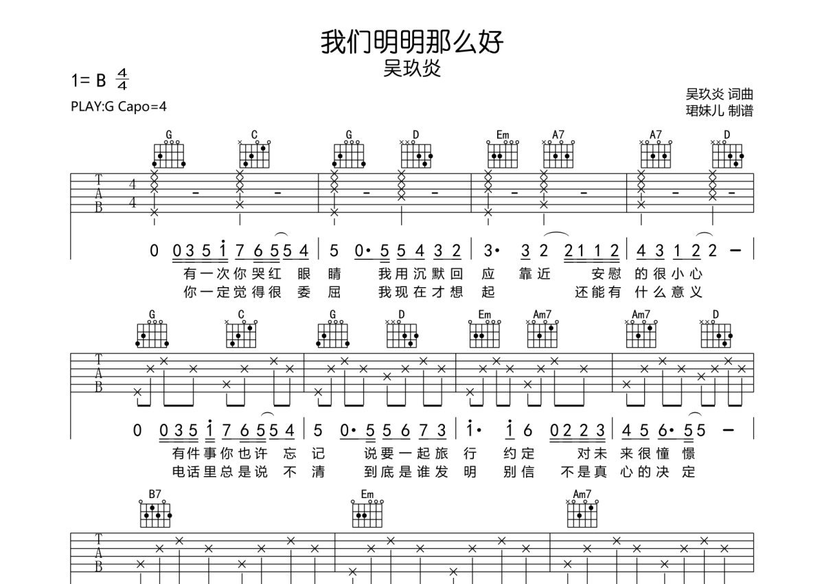 吴玖炎《我们明明那么好》吉他谱 - G调弹唱六线谱