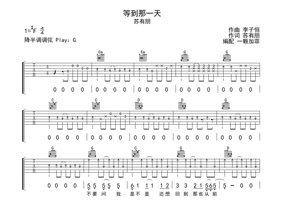 《等到那一天》是苏有朋演唱的一首歌曲,本吉他谱采用的是G调指法编配,这份吉他谱共有四张高清图谱,图谱由 @一颗加菲 编配上传,图谱使用六线谱编配,包含吉他和弦指法、简谱以及歌词部分,曲谱配备了相关的音频提供试听,使用这份等到那一天吉他谱,可以让你更加方便地掌握这首歌曲的弹唱技巧,快来尝试吧。