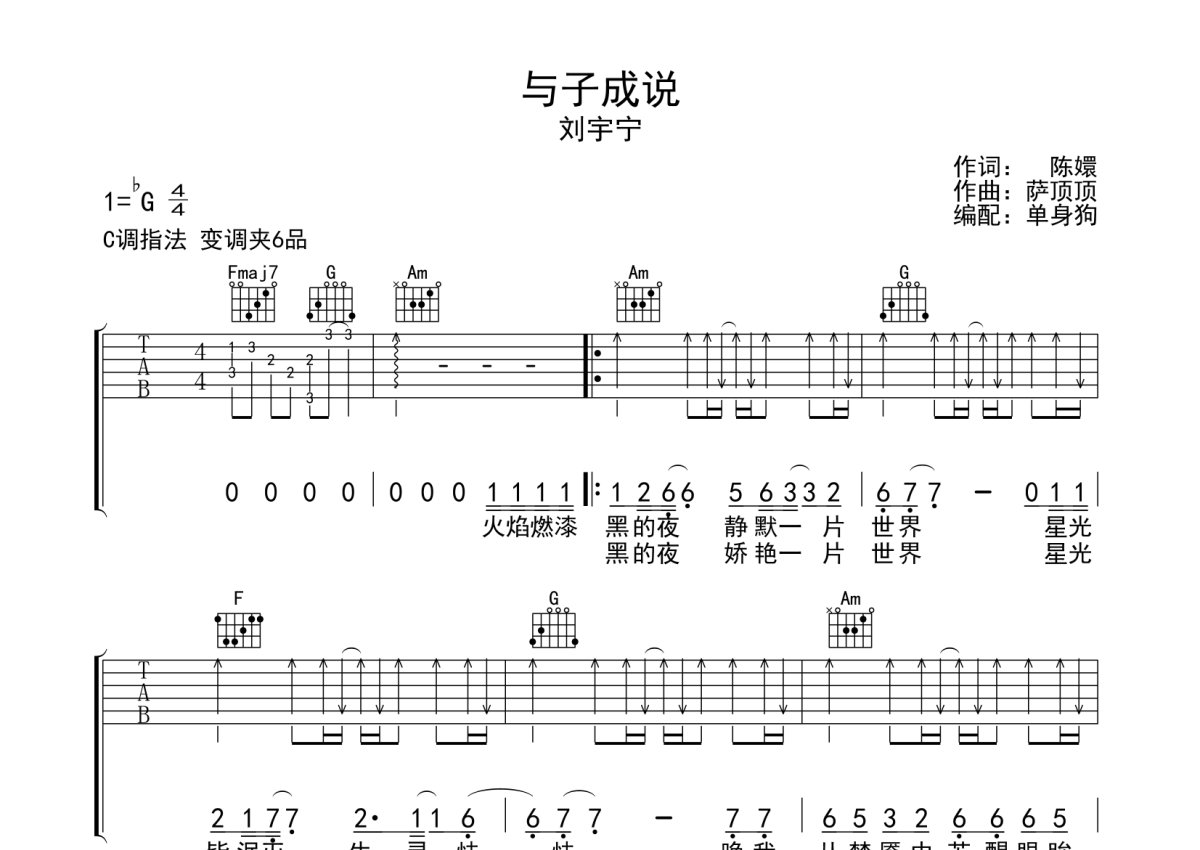 刘宇宁《与子成说》吉他谱 - C调弹唱六线谱