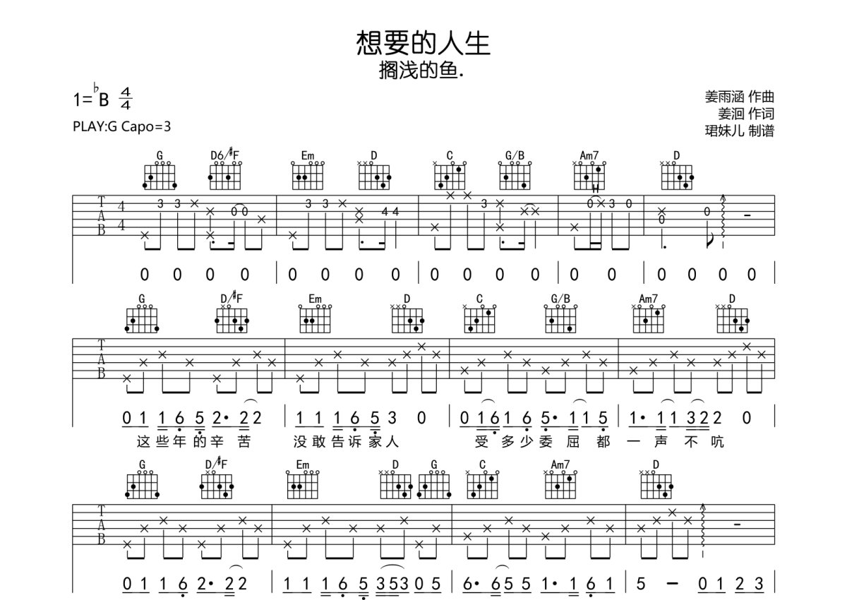 搁浅的鱼.《想要的人生》吉他谱 - G调弹唱六线谱