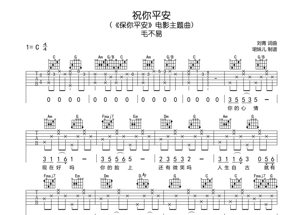 毛不易《祝你平安》吉他谱 - C调弹唱六线谱