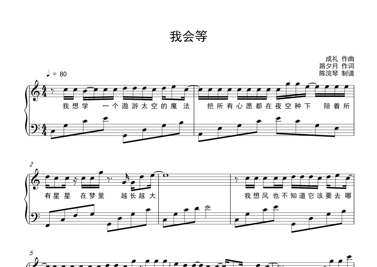 《我会等》是承桓演唱的一首歌曲,这份钢琴谱共有三张高清图谱,图谱由 @月隐云先知 编配上传,曲谱配备了相关的音频提供试听,使用这份我会等钢琴谱,可以让你更加方便地掌握这首歌曲的演奏技巧,快来尝试吧。承桓我会等钢琴谱,C调极简版钢琴五线谱,难度简单,适合初学者练习使用,共三页高清图谱,音频为片段仅供试听。