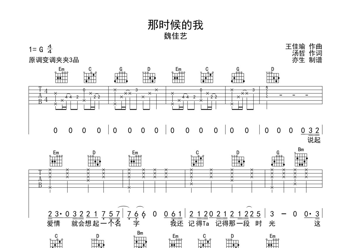 《那时候的我》是魏佳艺演唱的一首歌曲,本吉他谱采用的是G调指法编配,这份吉他谱共有两张高清图谱,图谱由 @亦生 编配上传,图谱使用六线谱编配,包含吉他和弦指法、简谱以及歌词部分,使用这份那时候的我吉他谱,可以让你更加方便地掌握这首歌曲的弹唱技巧,快来尝试吧。那时候的我吉他弹唱谱,本吉他谱采用G调和弦编配,演奏建议变调夹夹第3品,演奏速度大概95拍每分钟,难度简单。
