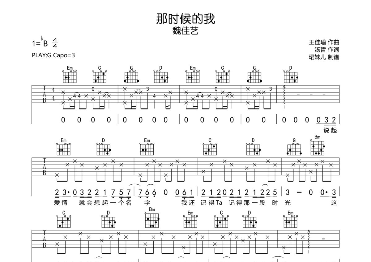 《那时候的我》是魏佳艺演唱的一首歌曲,本吉他谱采用的是G调指法编配,这份吉他谱共有两张高清图谱,图谱由 @珺妹儿 编配上传,图谱使用六线谱编配,包含吉他和弦指法、简谱以及歌词部分,使用这份那时候的我吉他谱,可以让你更加方便地掌握这首歌曲的弹唱技巧,快来尝试吧。用G调指法编,弹唱建议变调夹3品,速度85BPM难度较简单,易上手。