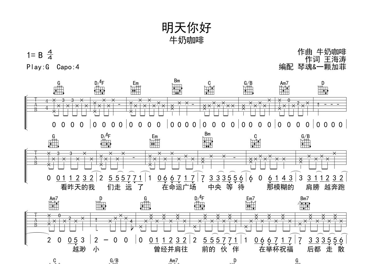 牛奶咖啡《明天你好》吉他谱 - G调弹唱六线谱