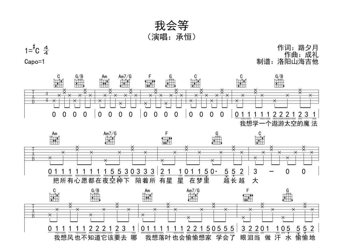承恒《我会等》吉他谱 - C调弹唱六线谱