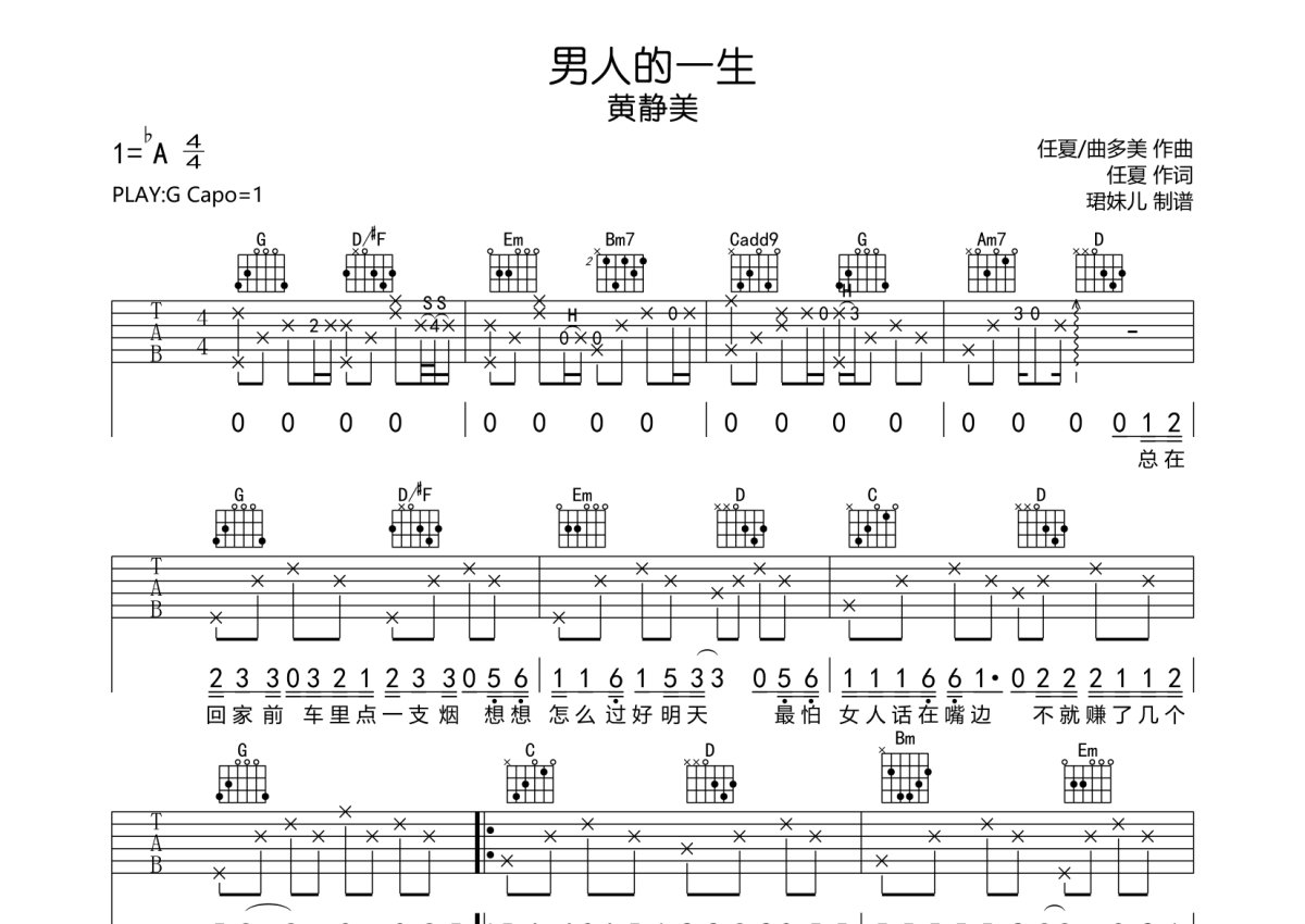 黄静美《男人的一生》吉他谱 - G调弹唱六线谱