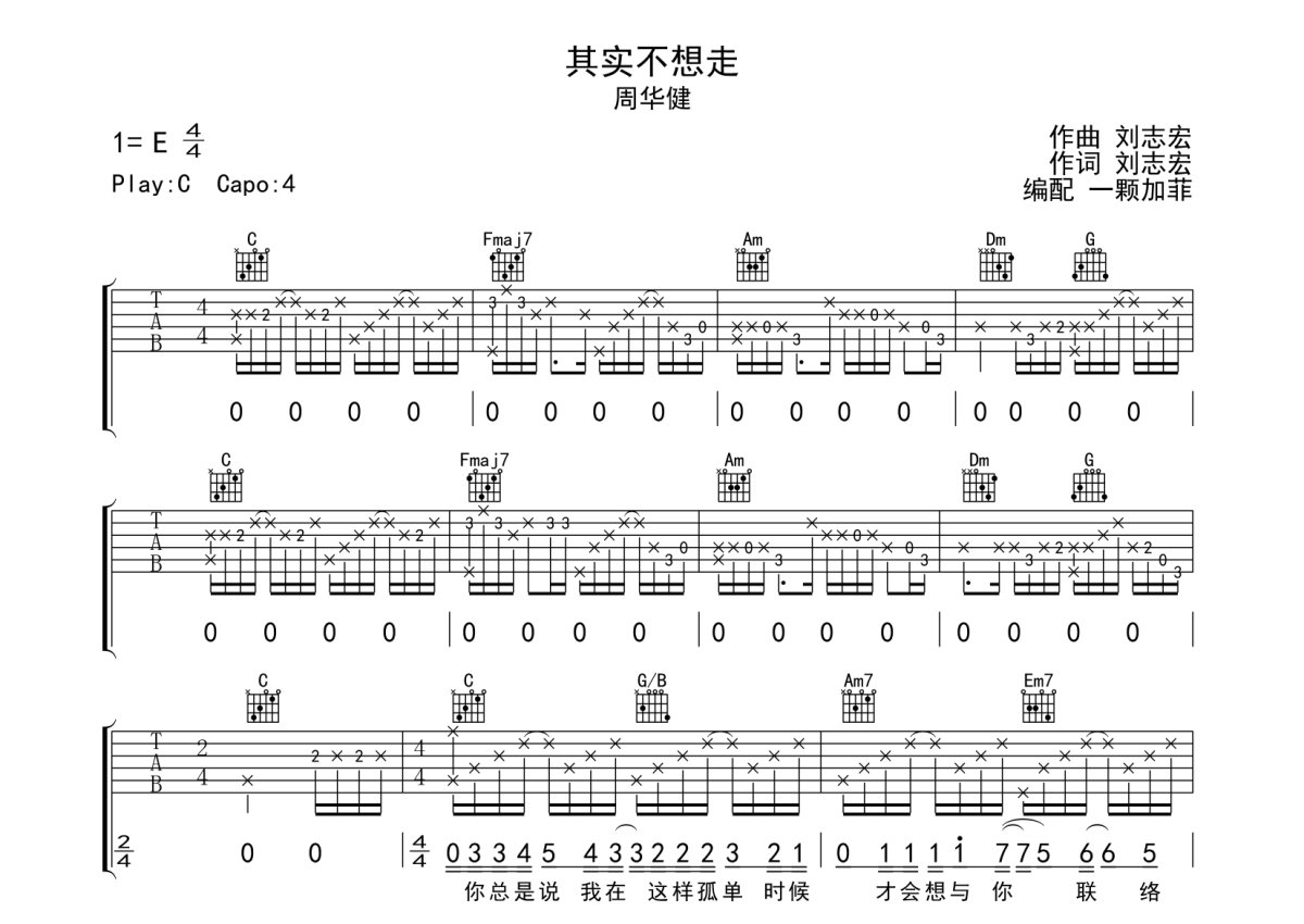周华健《其实不想走》吉他谱 - C调弹唱六线谱