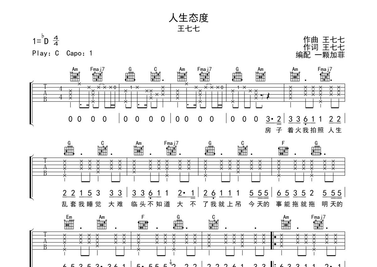 王七七《人生态度》吉他谱 - C调弹唱六线谱