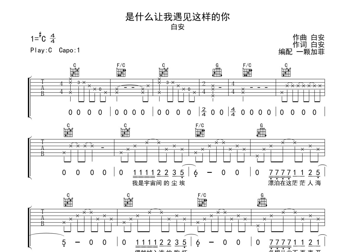 白安《是什么让我遇见这样的你》吉他谱 - C调弹唱六线谱