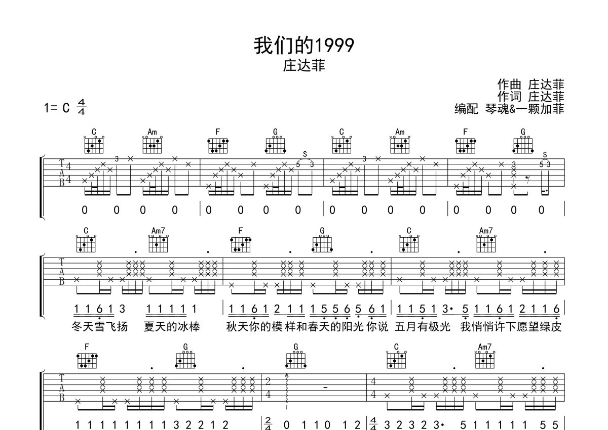 庄达菲《我们的1999》吉他谱 - C调弹唱六线谱