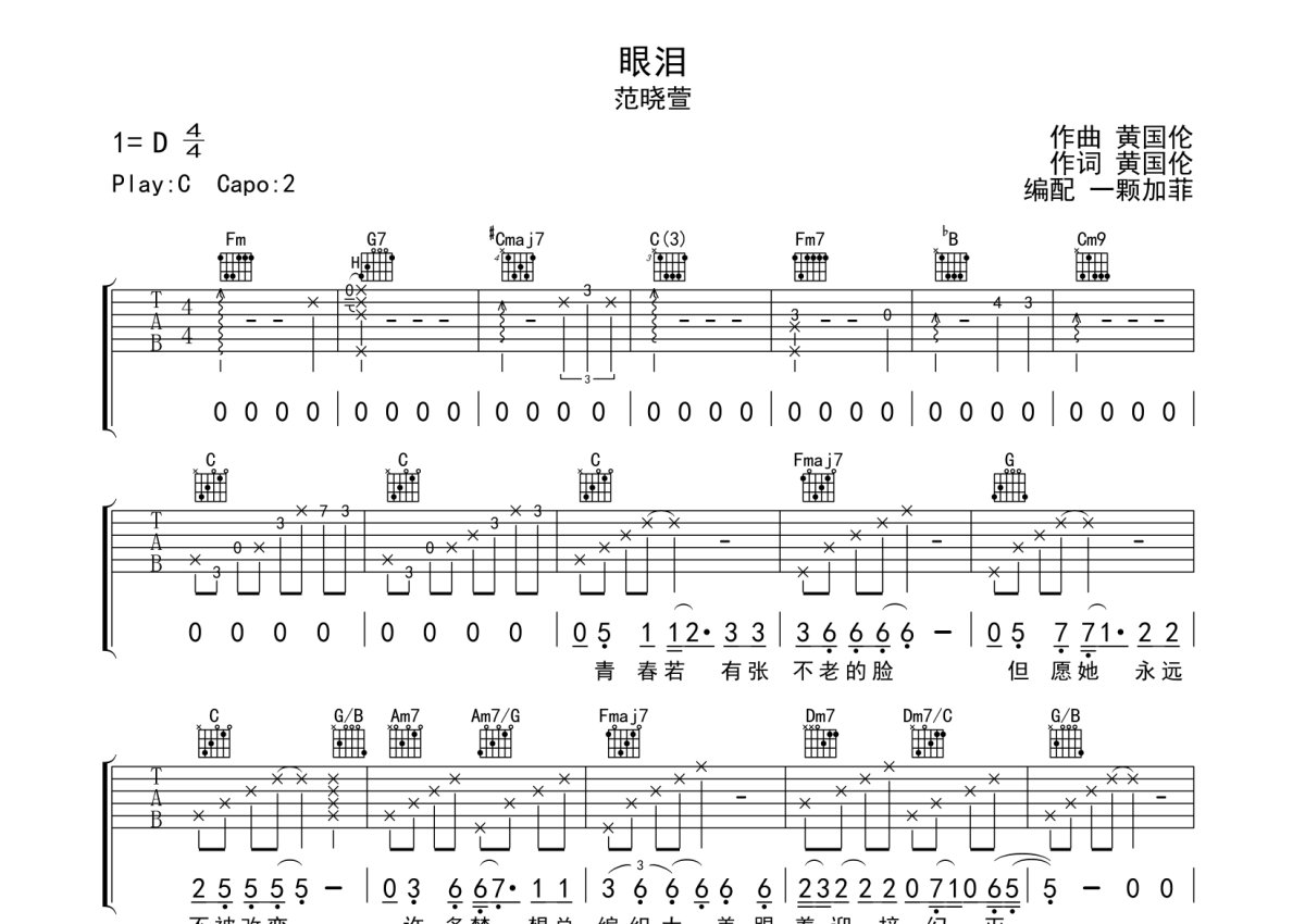 范晓萱《眼泪》吉他谱 - C调弹唱六线谱