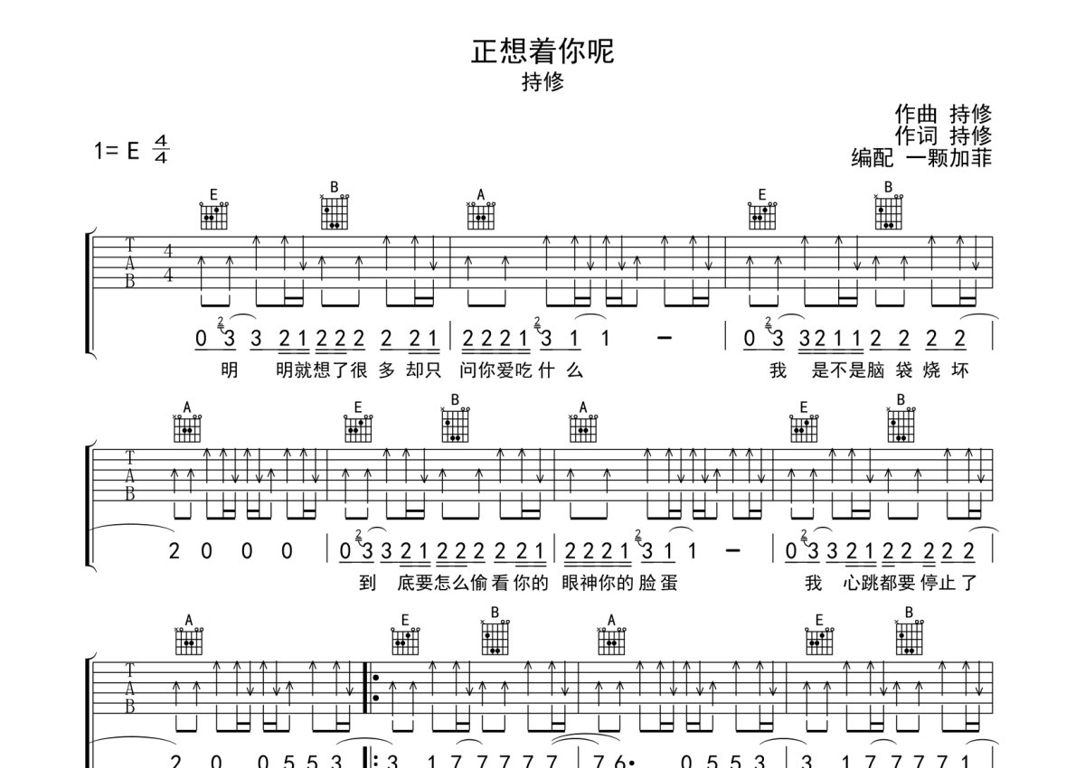 持修《正想着你呢》吉他谱 - E调弹唱六线谱