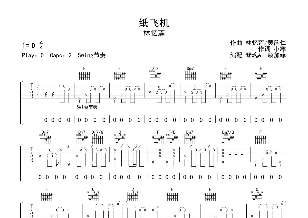 《纸飞机》是林忆莲演唱的一首歌曲,本吉他谱采用的是C调指法编配,这份吉他谱共有三张高清图谱,图谱由 @一颗加菲 编配上传,图谱使用六线谱编配,包含吉他和弦指法、简谱以及歌词部分,曲谱配备了相关的音频提供试听,使用这份纸飞机吉他谱,可以让你更加方便地掌握这首歌曲的弹唱技巧,快来尝试吧。