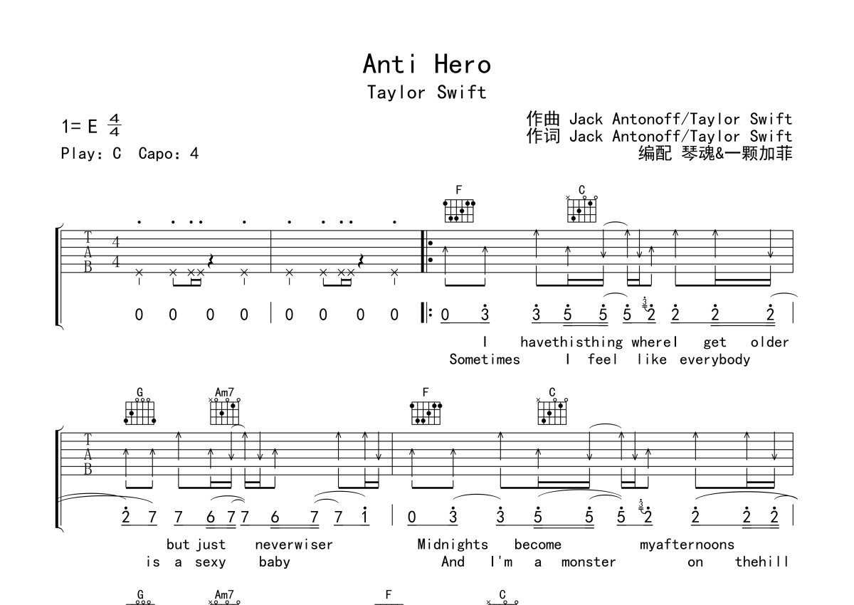 《Anti-Hero》是Taylor Swift演唱的一首歌曲,本吉他谱采用的是C调指法编配,这份吉他谱共有四张高清图谱,图谱由 @一颗加菲 编配上传,图谱使用六线谱编配,包含吉他和弦指法、简谱以及歌词部分,曲谱配备了相关的音频提供试听,使用这份Anti-Hero吉他谱,可以让你更加方便地掌握这首歌曲的弹唱技巧,快来尝试吧。