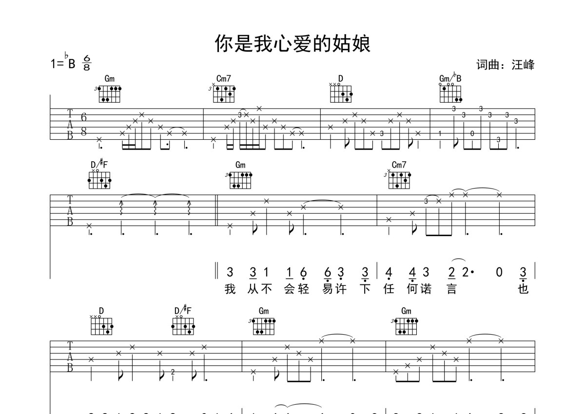 汪峰《你是我心爱的姑娘》吉他谱 - 弹唱六线谱 - 原版记谱