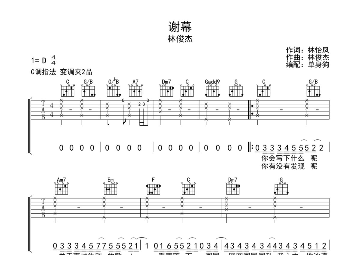 林俊杰《谢幕》吉他谱 - C调弹唱六线谱