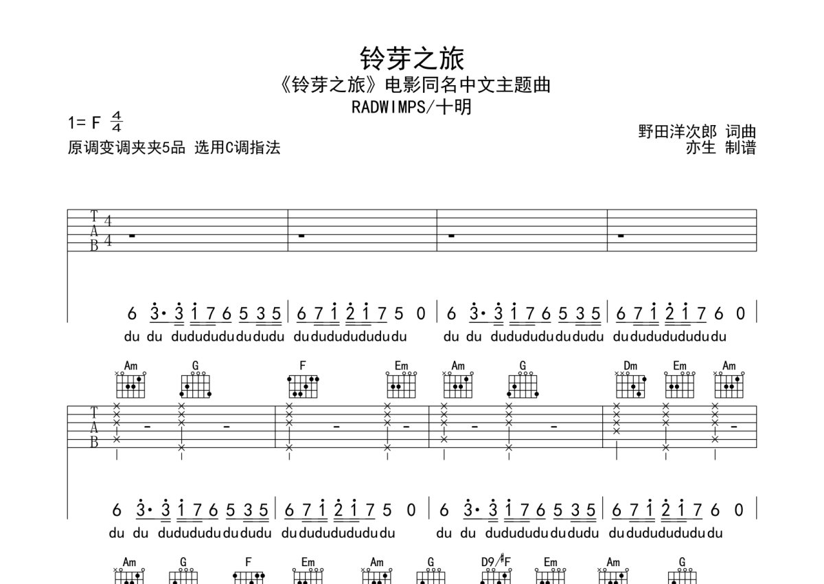《铃芽之旅》是RADWIMPS/十明演唱的一首歌曲,本吉他谱采用的是C调指法编配,这份吉他谱共有三张高清图谱,图谱由 @亦生 编配上传,图谱使用六线谱编配,包含吉他和弦指法、简谱以及歌词部分,使用这份铃芽之旅吉他谱,可以让你更加方便地掌握这首歌曲的弹唱技巧,快来尝试吧。铃芽之旅吉他谱,采用C调和弦指法演奏,推荐变调夹夹第5品,演奏速度大约每分钟90拍,演奏难度为简单。