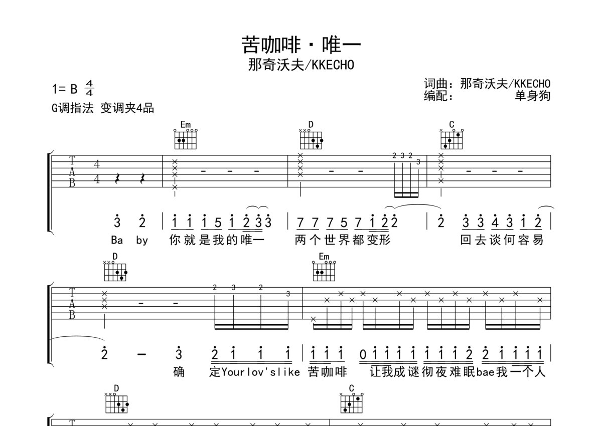 《苦咖啡唯一》是那奇沃夫/KKECHO演唱的一首歌曲,本吉他谱采用的是G调指法编配,这份吉他谱共有五张高清图谱,图谱由 @单身狗 编配上传,图谱使用六线谱编配,包含吉他和弦指法、简谱以及歌词部分,使用这份苦咖啡唯一吉他谱,可以让你更加方便地掌握这首歌曲的弹唱技巧,快来尝试吧。