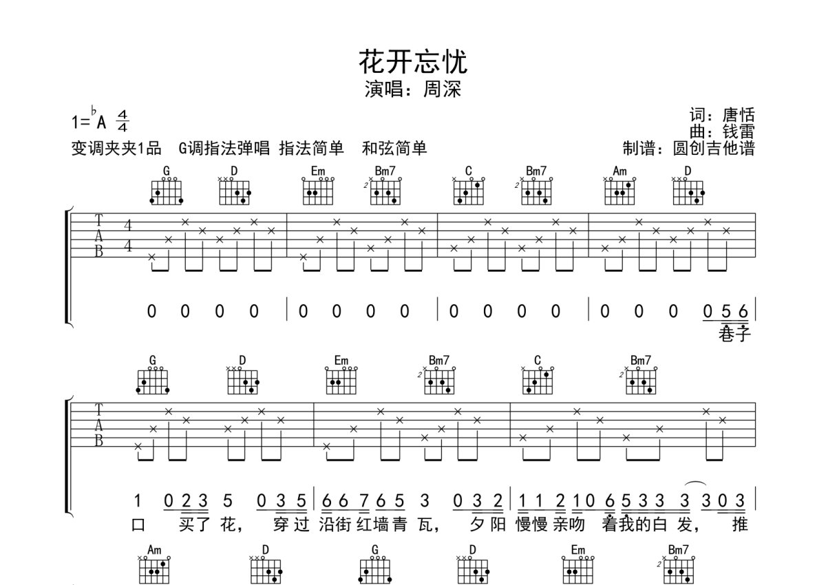 《花开忘忧》是周深演唱的一首歌曲,本吉他谱采用的是G调指法编配,这份吉他谱共有三张高清图谱,图谱由 @圆创吉他谱 编配上传,图谱使用六线谱编配,包含吉他和弦指法、简谱以及歌词部分,曲谱配备了相关的音频提供试听,使用这份花开忘忧吉他谱,可以让你更加方便地掌握这首歌曲的弹唱技巧,快来尝试吧。花开忘忧吉他谱,周深演唱,彼岸花开,忘忧入梦,唱出平行时空与现实的交织,偶尔的遗憾也许正在成就另外一个角落的美满。心有信念,花终开,梦终圆。 《花开忘忧》吉他弹唱谱,原调bA,变调夹夹一品,选用G调指法编配,。