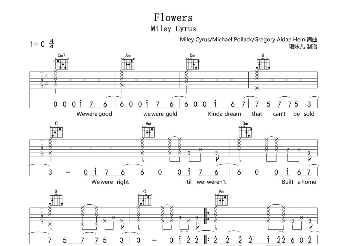 《Flowers》是Miley Cyrus演唱的一首歌曲,本吉他谱采用的是C调指法编配,这份吉他谱共有三张高清图谱,图谱由 @珺妹儿 编配上传,图谱使用六线谱编配,包含吉他和弦指法、简谱以及歌词部分,使用这份Flowers吉他谱,可以让你更加方便地掌握这首歌曲的弹唱技巧,快来尝试吧。用C调指法编,,速度110BPM难度较简单,易上手。