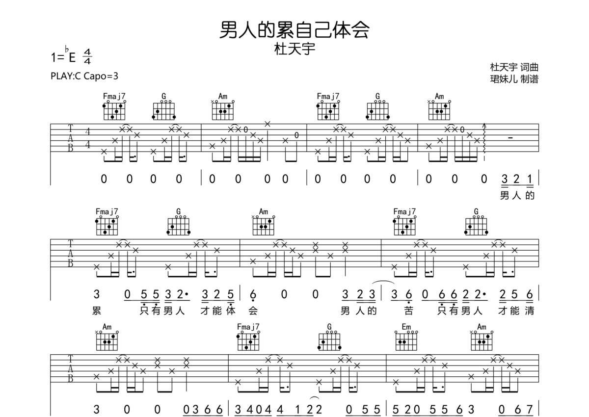 《男人的累自己体会》是杜天宇演唱的一首歌曲,本吉他谱采用的是C调指法编配,这份吉他谱共有三张高清图谱,图谱由 @珺妹儿 编配上传,图谱使用六线谱编配,包含吉他和弦指法、简谱以及歌词部分,使用这份男人的累自己体会吉他谱,可以让你更加方便地掌握这首歌曲的弹唱技巧,快来尝试吧。用C调指法编,,弹唱建议变调夹3品,速度85BPM难度较简单,易上手。
