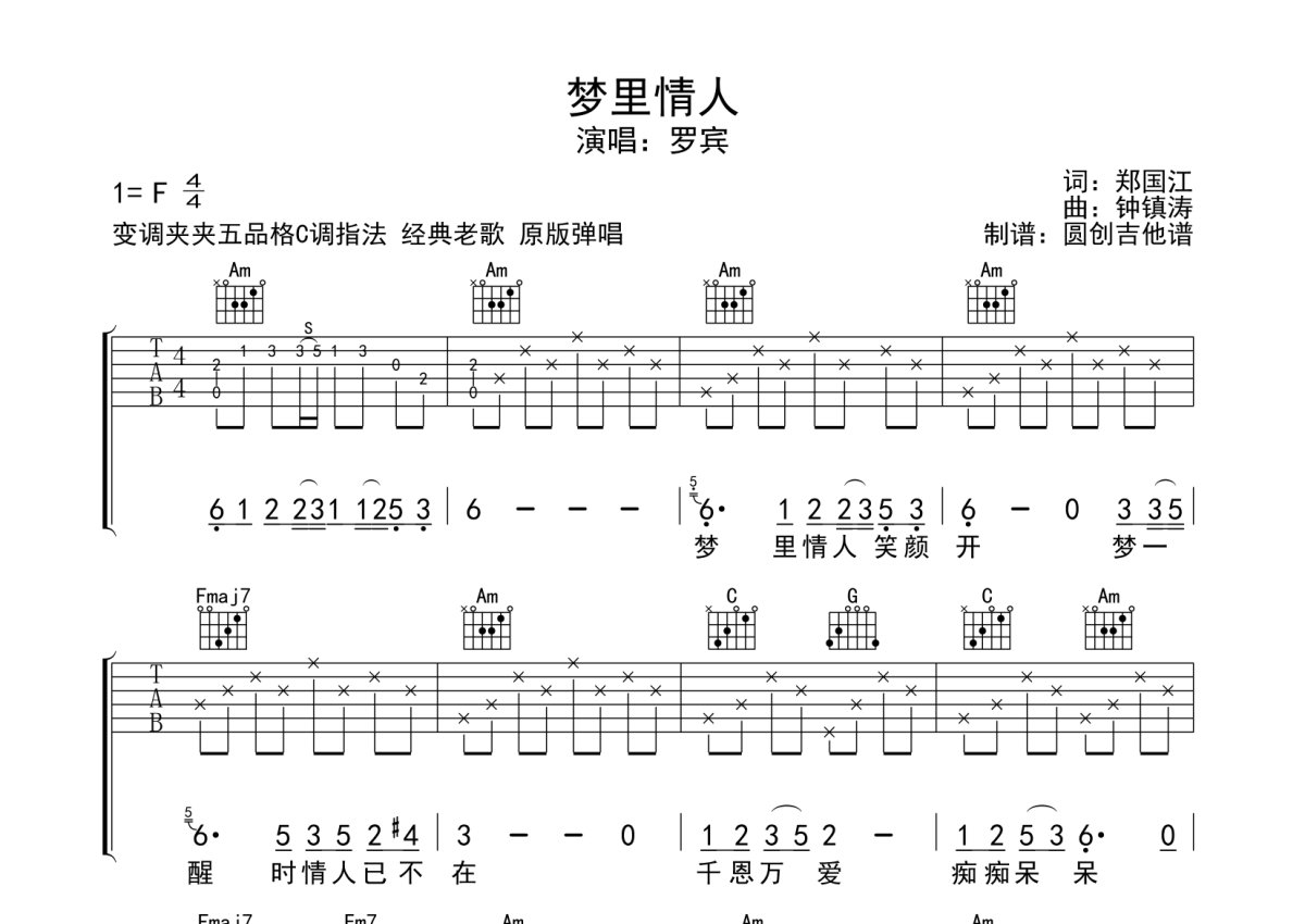 罗宾《梦里情人》吉他谱 - F调弹唱六线谱