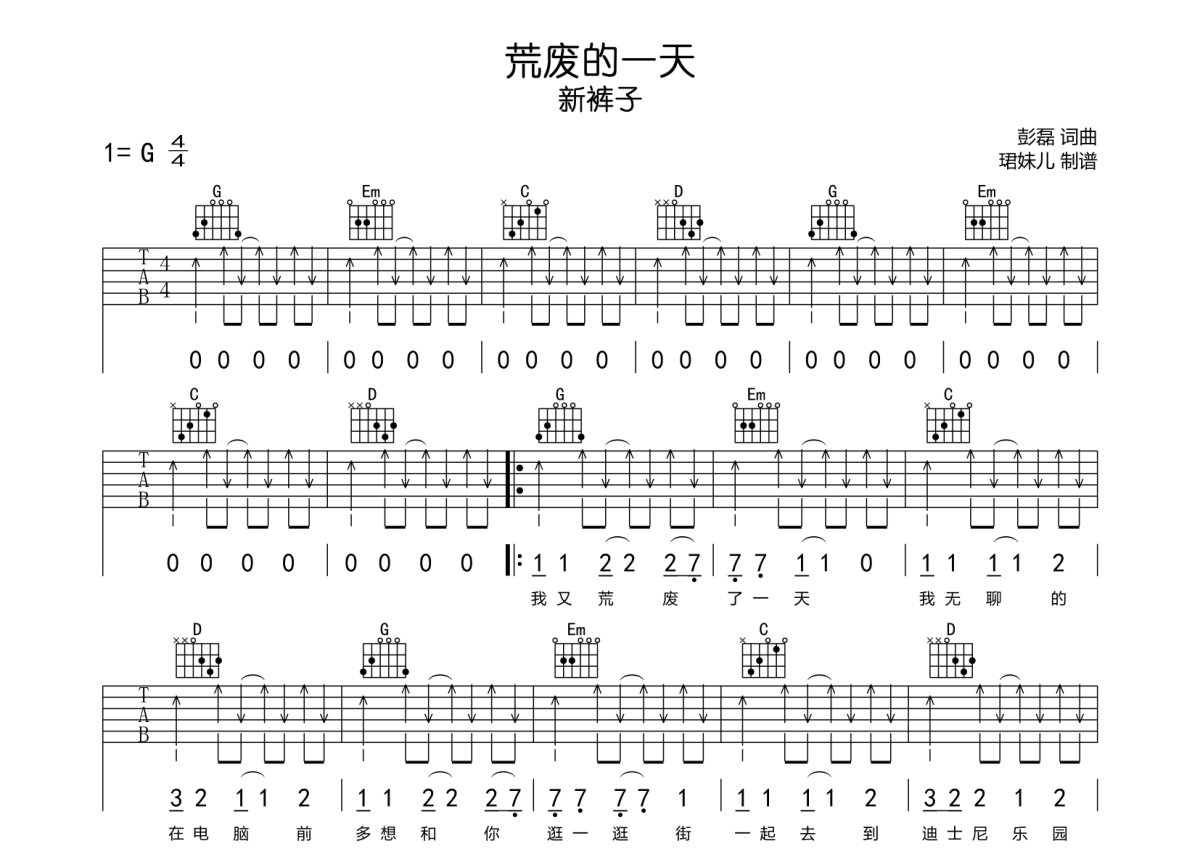新裤子《荒废的一天》吉他谱 - G调弹唱六线谱