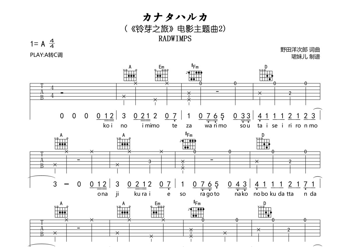 RADWIMPS《カナタハルカ》吉他谱 - C调弹唱六线谱 - 铃芽之旅主题曲2