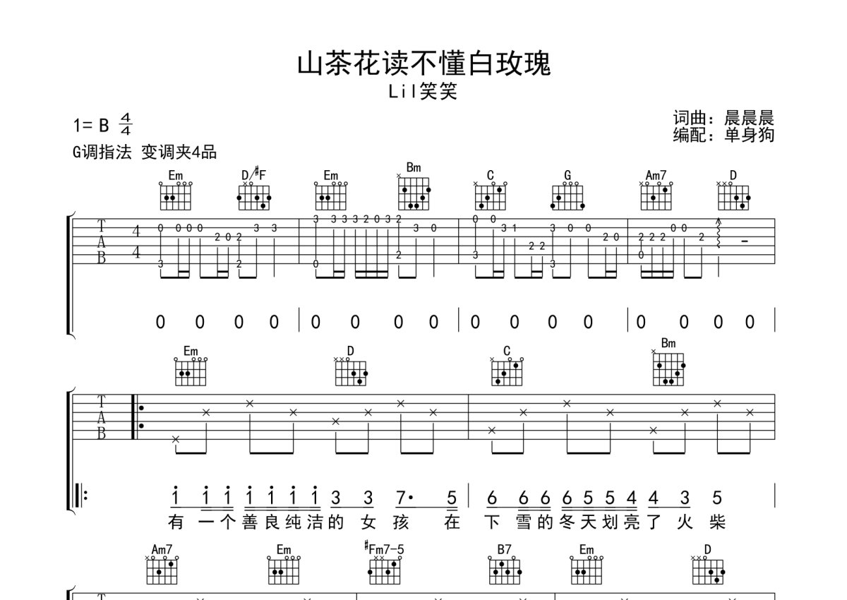 Lil笑笑《山茶花读不懂白玫瑰》吉他谱 - G调弹唱六线谱