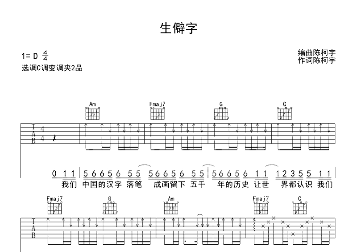 陈柯宇《生僻字》吉他谱 - C调弹唱六线谱