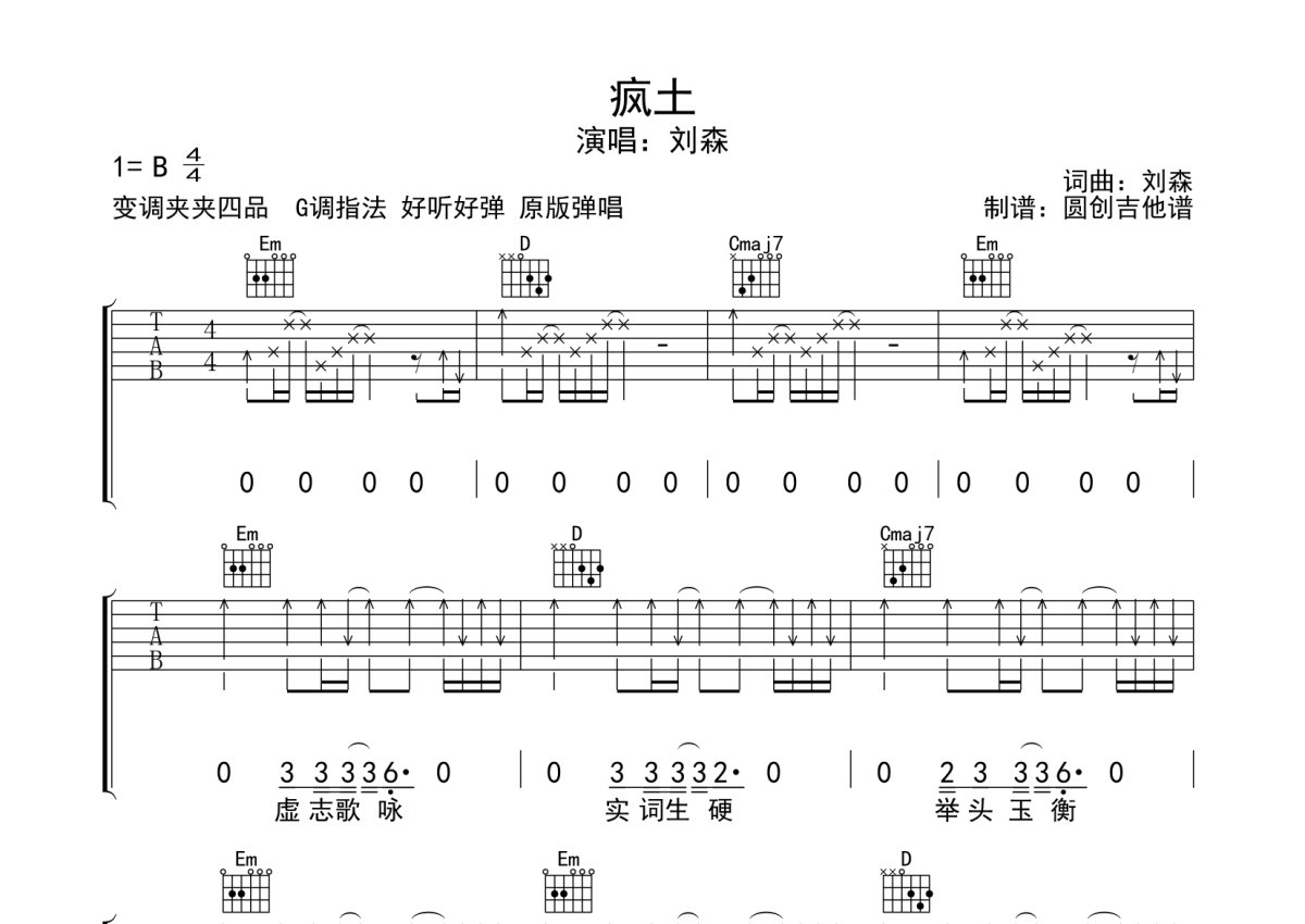 刘森《疯土》吉他谱 - G调弹唱六线谱