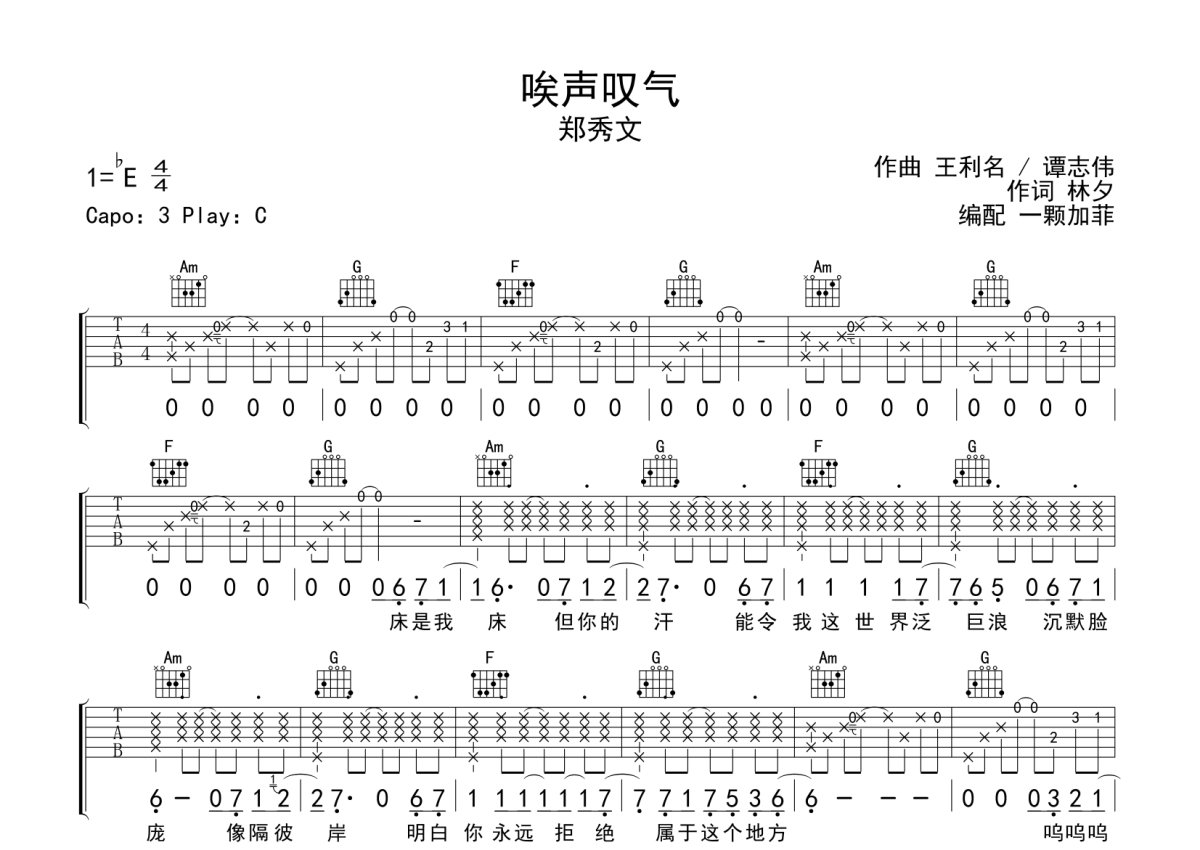 郑秀文《唉声叹气》吉他谱 - C调弹唱六线谱