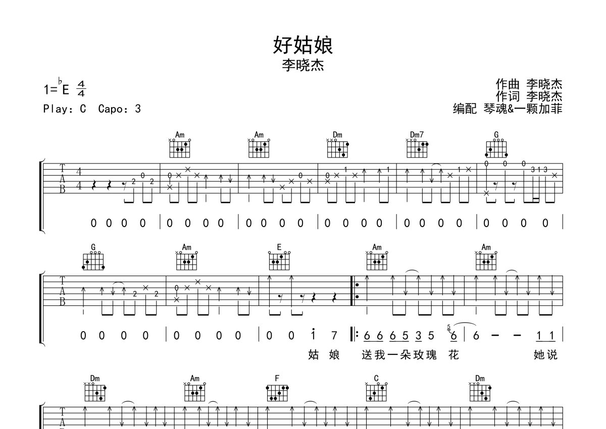 《好姑娘》是李晓杰演唱的一首歌曲,本吉他谱采用的是C调指法编配,这份吉他谱共有三张高清图谱,图谱由 @一颗加菲 编配上传,图谱使用六线谱编配,包含吉他和弦指法、简谱以及歌词部分,曲谱配备了相关的音频提供试听,使用这份好姑娘吉他谱,可以让你更加方便地掌握这首歌曲的弹唱技巧,快来尝试吧。