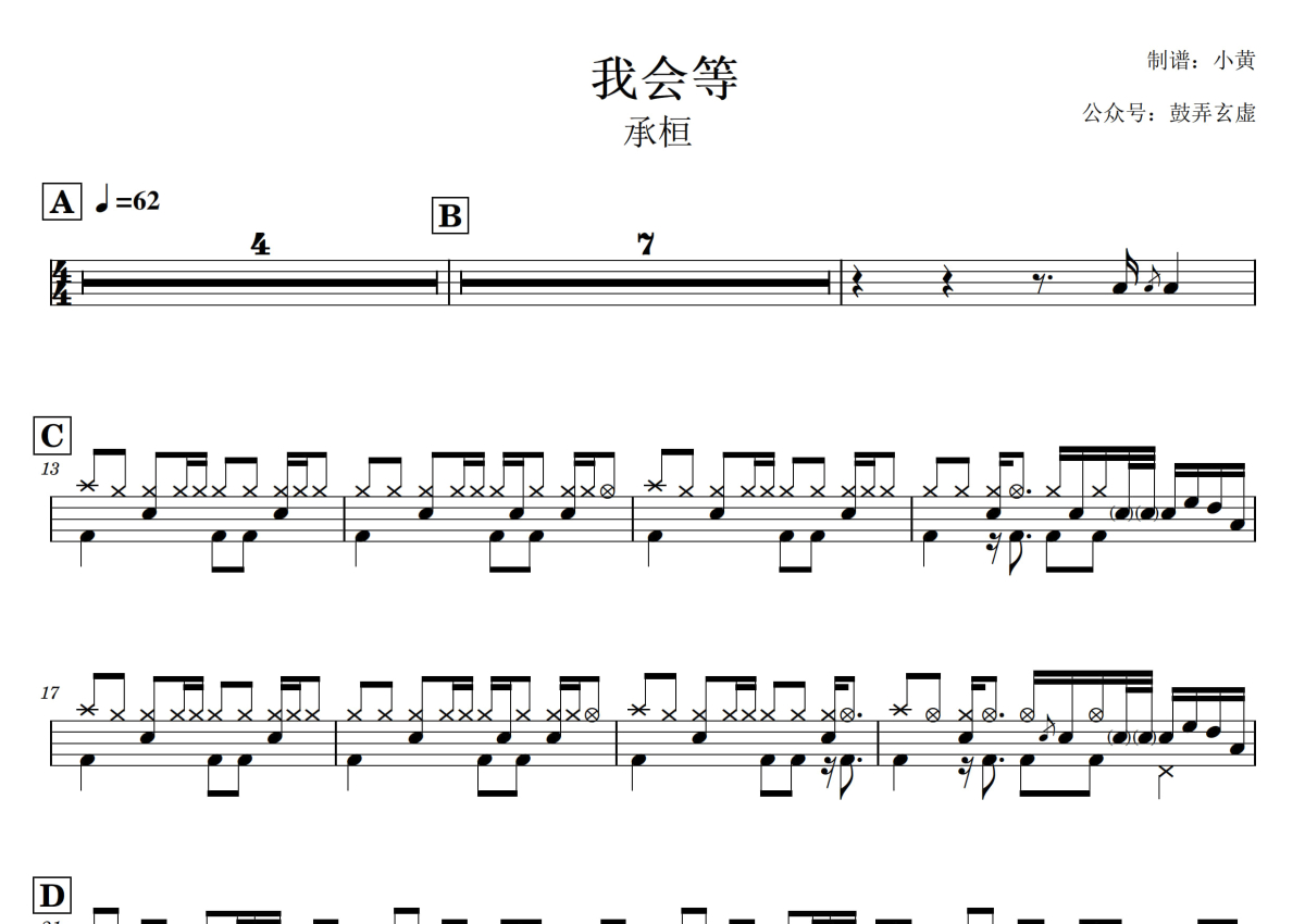 《我会等》是承桓演唱的一首歌曲,这份鼓谱共有两张高清图谱,图谱由 @小黄 编配上传,图谱使用五线谱编配,使用这份我会等架子鼓谱,你将能够轻松地敲打出这首承桓的我会等,快来尝试吧。