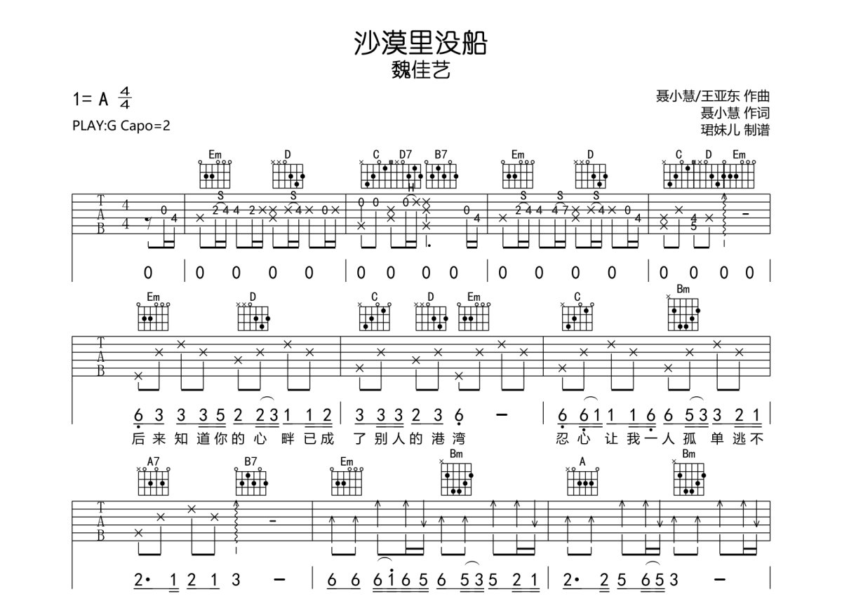 魏佳艺《沙漠里没船》吉他谱 - G调弹唱六线谱