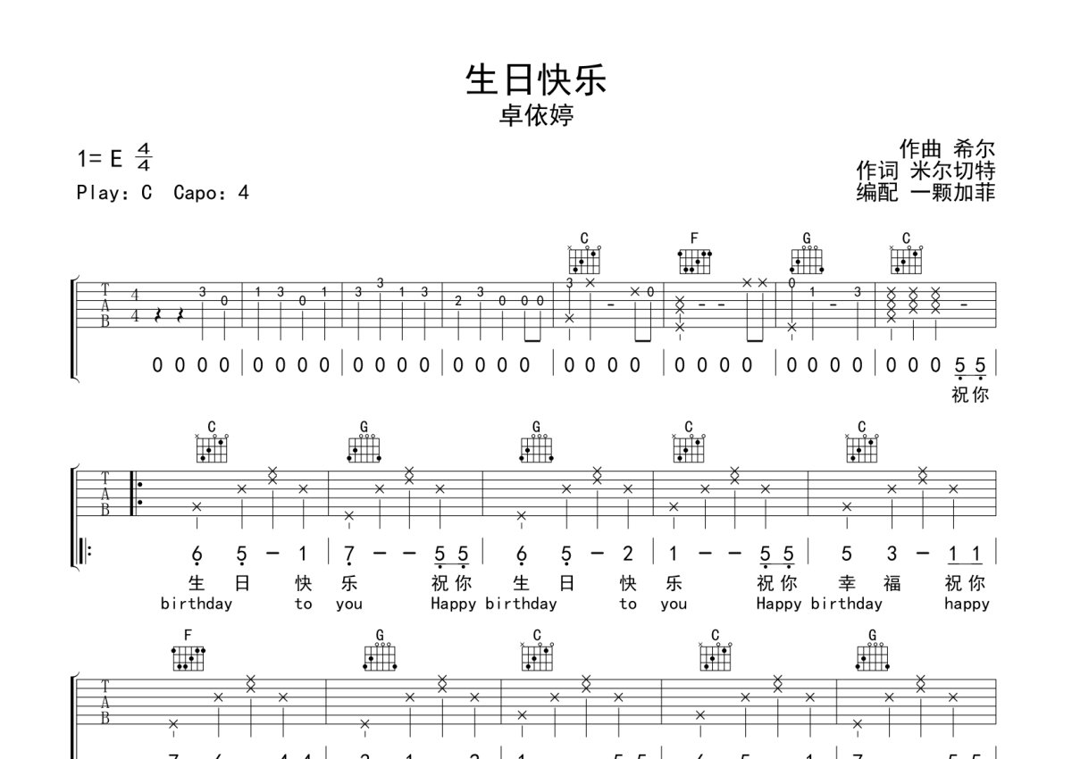 卓依婷《生日快乐》吉他谱 - C调弹唱六线谱