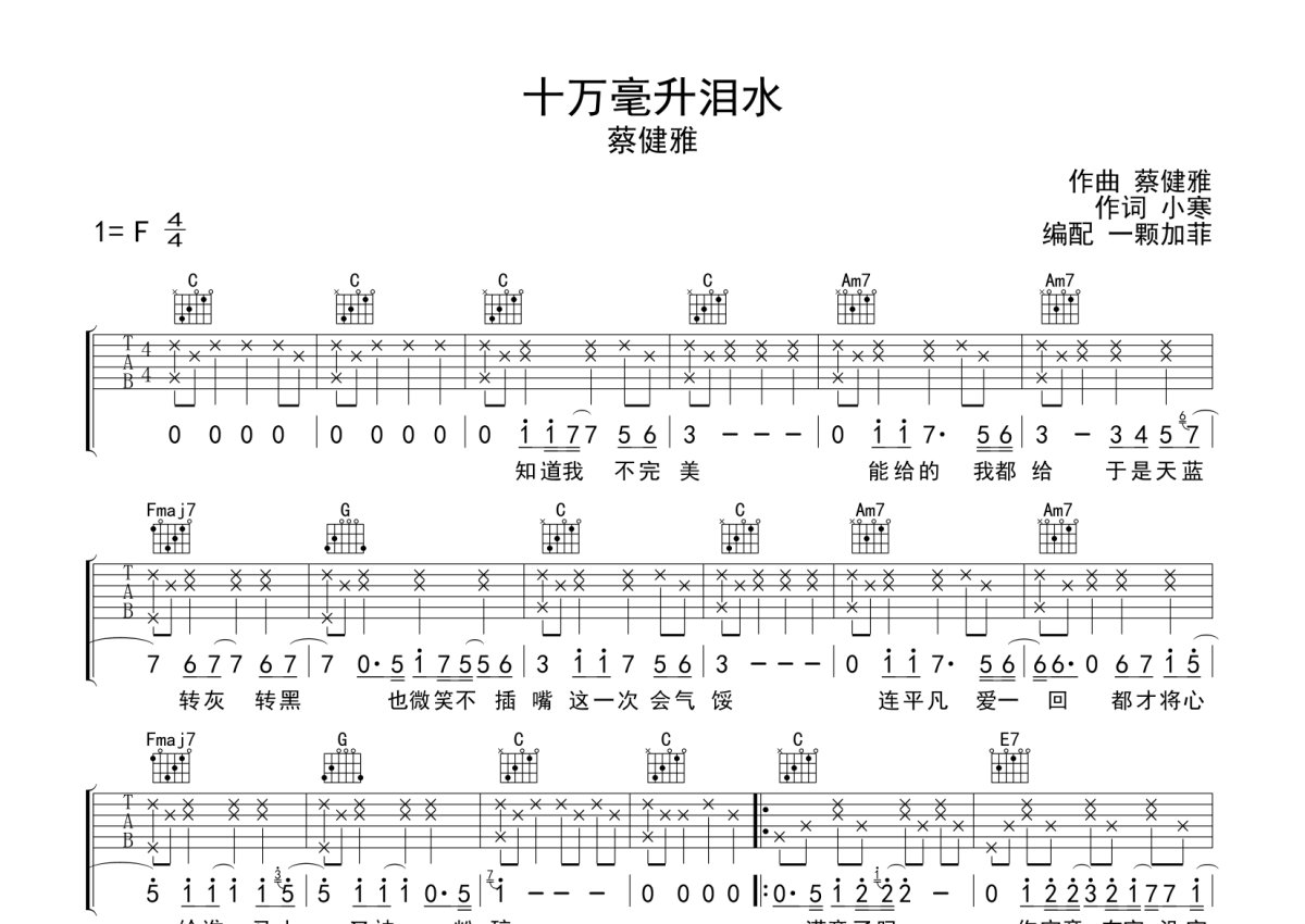《十万毫升泪水》是蔡健雅演唱的一首歌曲,本吉他谱采用的是C调指法编配,这份吉他谱共有两张高清图谱,图谱由 @一颗加菲 编配上传,图谱使用六线谱编配,包含吉他和弦指法、简谱以及歌词部分,曲谱配备了相关的音频提供试听,使用这份十万毫升泪水吉他谱,可以让你更加方便地掌握这首歌曲的弹唱技巧,快来尝试吧。